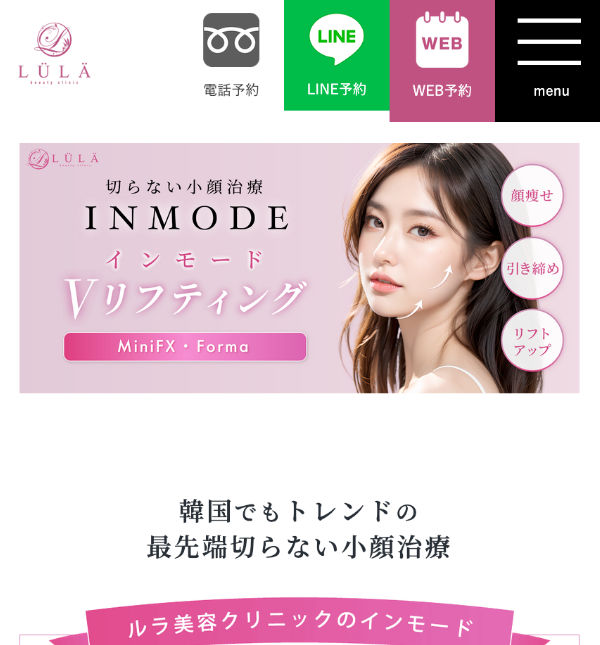 さらにルラでは、糸リフト(ルラリフト)、小顔脂肪吸引、大豆注射(脂肪溶解注射)など小顔まわりのメニューが豊富で、インモード単体〜脂肪吸引や糸リフトとの組み合わせまでワンストップで相談できるのが特徴です。