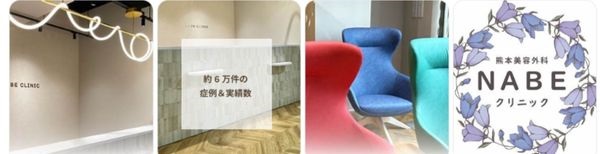 | 熊本美容外科NABEクリニック | 手取本町/通町筋電停徒歩1分 | 肝斑・紅潮・毛穴・リジュビネーション(Sチップ) | 38,800円 | ドラッグデリバリーCP+マックーム 69,800円(モニター63,800円)など |